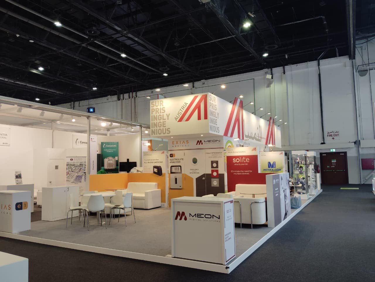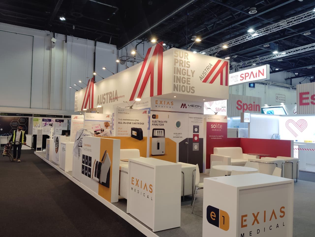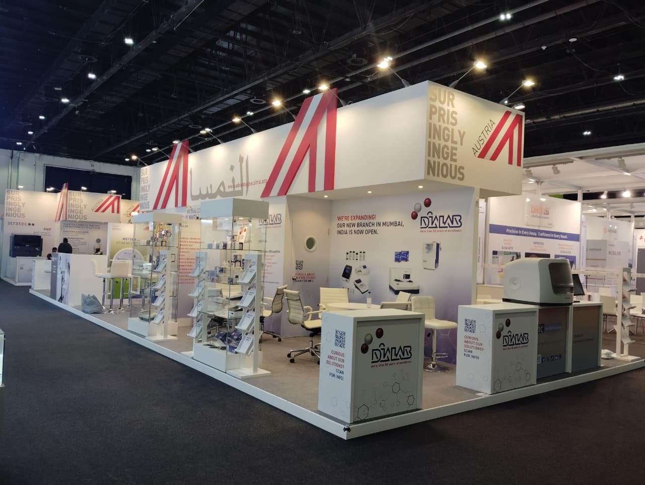 Completed electrical installation works for Austria exhibition stand during WHX at Expo 2020, including lighting systems and power distribution.